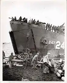 Hq Co was posted to the 23rd Marines support group and was the Hq for yellow beaches 1 and 2.[12] They came ashore at 1445 from the APA 196 – USS Logan. The company had two 30 man infantry security sections plus two 30 cal. machine guns on the beach defense parameter until their ratings were needed. The medics had one Dr. MIA another Dr., the Dentist and six corpsmen were made casualties by a single shell. Even so, 133's corpsman established an evacuation station on blue 1.[6] Also with Hq Co. was a 32-man team from the 8th Marine Depot Company to manage the depots on yellow beaches.