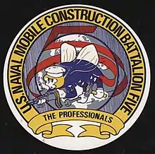 Naval Construction Battalion 5 was commissioned on May 25, 1942 at Camp Allen Va.[2] The battalion went to Port Hueneme and shipped out for the first of two deployments in the Pacific. When the war ended CB 5 was decommissioned in the Philippines. On July 10, 1951 the Battalion was re-commissioned as a MCB and remains an active unit today.