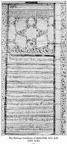 Wedding certificate of Baháʼu'lláh and Ásíyih K͟hánum (1835).