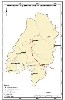 Ndian division was formed in 1975 from parts of Kumba and Victoria divisions and is one of six administrative units that constitute the Southwest Region. Its headquarters is in Mundemba and other major towns include Ekondo Titi, Bamusso, Isangele, Toko, Bekora and Dikome Balue.[1][2] A total of nine municipalities (Bamusso, Dikome Balue, Ekondo Titi, Idabato, Isangele, Kumbo Abedimo, Kumbo Itindi, Mundemba and Toko) make up the division and spread across an estimated surface area of about 6,626 km2 (2,558 sq mi) (25% of the region). The division is linked to other major towns of Cameroon (such as Kumba in the Meme) by the national road N16 and which passes through Ekondo Titi onwards to Mundemba and Isangele.[3]
