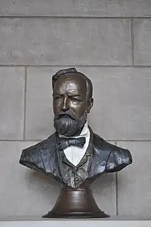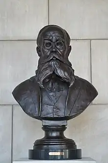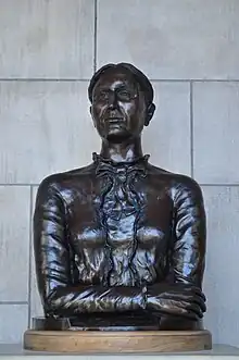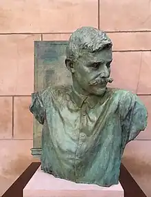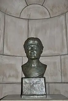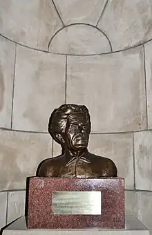 On June 6, 1961, the Nebraska State Legislature also accepted a bust of John G. Neihardt and resolved to permanently place it "in one of the niches in the corridors of the State Capitol."[5] The state dedicated the Neihardt bust on December 7, 1961, and placed it in a large niche above the landing of the northeast stairwell.[6] On April 3, 1962, the state moved the Neihardt bust to the southwest niche of the Great Hall (across from the Norris bust) after protests pronounced that the bust's previous location was improper.[7] On March 21, 1974, the Nebraska Hall of Fame Commission elected Neihardt to the hall of fame, and the commission grandfathered his bust into its statuary collection at the capitol.[8]
