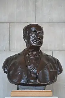 On May 23, 1961, the family of U.S. Senator George W. Norris gave a bust of Norris to the State of Nebraska. In celebration of the centenary of his birth, the state placed the Norris bust in the southeast niche of the Great Hall of the capitol.[1] One month later, the Nebraska State Legislature established the Nebraska Hall of Fame and the Nebraska Hall of Fame Commission.[2] The commission chose Norris as the first member on November 21, 1961.[3] The state permitted the commission to use the Norris bust in the capitol as the senator's statuary representation in the hall of fame.[4]