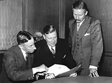The Netherlands Union was founded on 24 July 1940 only a few weeks after the completion of the German invasion of the Netherlands. It was created by Dr Louis Einthoven who had been Chief of Police in Rotterdam, Johannes Linthorst Homan who had been Queen's Commissioner in Groningen, and Professor Jan de Quay who had been part of the Roman Catholic State Party.[3] On the day of its founding, the three circulated a manifesto setting out the goals of the movement. It called on the Dutch to accommodate themselves to the new political reality of the German occupation and promoted "a loyal attitude of towards the occupying power" in the interests of a wider moral and political regeneration of Dutch society.[3] It has been compared with the programme of the early Vichy regime in France.[3]
