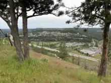 A cliff-ringed butte 5 miles (8.0 km) north of downtown Spokane, Five Mile is one of Spokane's newer residential areas. Homes here tend to be more costly due to the views, and the fact that the area lies within the Mead School District. Sky Prairie Park, Prairie View Elementary School and the Five Mile Grange are community hubs. The butte's north and west slopes remain wild and forested. Although no retail business districts exist atop the hill, it overlooks the commercial centers of Francis Avenue to the south, Indian Trail Road to the west, Wandermere to the northeast and North Division to the east. Mead High School is 1 mile (1.6 km) north of the hill. Holy Family hospital lies 2 miles (3.2 km) southeast.