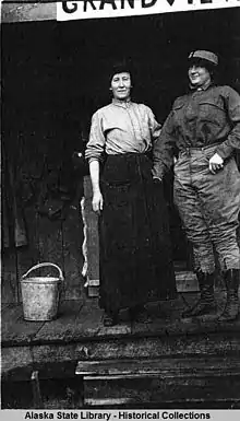 Nellie Neal Lawing (1874-1956), known as Alaska Nellie, was an Alaskan frontierswoman, roadhouse operator, and hunter. Born in Missouri, Lawing moved to Alaska in 1915 after leaving her first marriage. She worked as a camp cook until the next spring, when she won a government contract to open a roadhouse along the Alaska Railroad. Her first roadhouse was located at Mile 45 of the railroad, an area which she named Grandview; while at the roadhouse, she gained a reputation as a hunter and dog sled musher and became a local hero after saving a mail carrier in a blizzard.[1] She later ran the Kern Creek Roadhouse and a roadhouse in the Hurricane area. While working at the latter roadhouse in 1923, she met then-U.S. President Warren G. Harding, members of his cabinet, and Alaska Governor Scott Bone, who were traveling the railroad to honor its completion.[2]