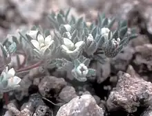 This is a small annual herb forming cushions of foliage at ground level, the stems no more than a centimeter long. The hairy, spoon-shaped leaves are 2 to 3 millimeters long. The inflorescence is a headlike cluster of flowers on hairlike pedicels. The flower has hairy sepals one millimeter long and a white corolla up to 3 millimeters long. The fruit is a tiny capsule with a rounded end and a pointed tip.[2]