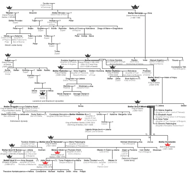 | Grand Prince Stefan Nemanja ![]() r. 1166–1196 | Anastasia | ||||||||||||||||||||||||