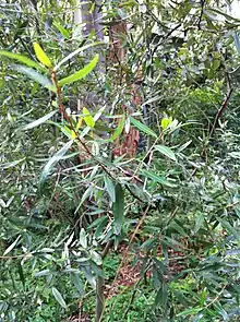 Nematolepis wilsonii (shiny nematolepis) is an endangered shrub or small tree species which is endemic to Victoria in Australia. It may grow up to 10 metres tall and has mottled bark. The shiny green leaves are 30 to 80 mm long and 5 to 15 mm wide, and have silvery scales underneath. Star-shaped white flowers are produced in groups of 1 to 9 in the leaf axils in spring.[2]