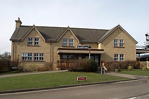 Wansford is the headquarters of the railway and most of the facilities are based here. The current station building was opened in 1995 and contains a ticket office, shop, cafe and toilets. The locomotive sheds are located at this station. Also at the station there is a miniature railway, picnic area and children's playground.[1] The station was formerly the junction for a branch to Stamford, which diverged to the north just east of the river bridge at Wansford. The original Wansford station is located on platform three and was built in 1844–1845 in Jacobean style for the opening of the railway. This building was purchased by the railway in 2015.