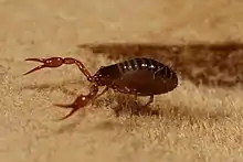 Specimens of this species are about 5 millimetres (0.20 in) long. They are primarily dark brown with four pairs of legs, and dark red claws.