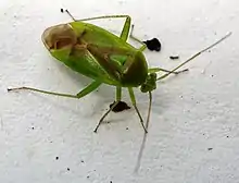 Neolygus viridis is a true bug. The species is found in the Palearctic, from Europe (with the exception of the southern parts of the Mediterranean) to Siberia and the Russian Far East, and it is common and widespread in Central Europe. It occurs in semi-shady to open places with high humidity, such as around the edges of woods or meadows, but also on isolated trees.