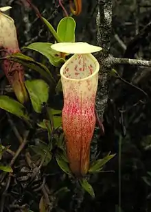 Nepenthes alba is a tropical pitcher plant endemic to Peninsular Malaysia.[13] The specific epithet alba is derived from the Latin word albus, meaning "white", and refers to the colour of the upper pitchers.[13]