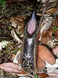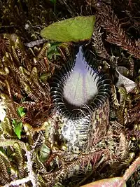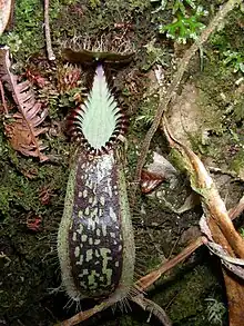 The pitcher lid or operculum is elliptic to ovate and measures up to 6 cm in length by 5 cm in width.[4] It is held roughly horizontally and often has upturned margins. The apex is rounded,[7] whereas the base is occasionally cordate[4] or subcordate.[7] No appendages are present on the lower surface, but multicellular filiform appendages may be found on the upper surface, though this feature is often unstable and may be absent altogether. These 'hairs' or 'tentacles' are up to 20 mm long and may be branched.[4] They arise from the ends of the lid veins and may number as many as 45 on each side of the lid. They are mainly restricted to the outer margins of the lid, where they are around 3 rows deep. The lower surface of the lid bears sparsely distributed nectar glands in the form of shortly elliptic, bordered pits. These are very small and inconspicuous, measuring only 0.1–0.2 mm in diameter.[7] A spur up to 9 mm long is inserted near the base of the lid. It may be simple or repeatedly branched[4] to the point of being fasciculate. The herbarium material examined by Cheek and Jebb exhibited spurs that were basally 5-branched, with each branch being secondarily ramified.[7]