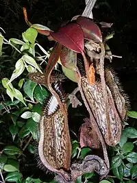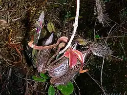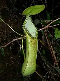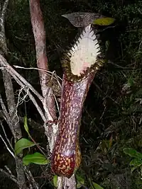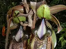 Rosette and lower pitchers are only produced for a short time before the plant transitions into a scrambling vine (although they may be produced later on offshoots from the original stem). They grow up to 18 cm high by 5 wide. They are ovate in the basal fifth to half of the pitcher cup, being bulbous to varying degrees in this portion,[4] often narrowly so.[7] The pitcher is narrower in the upper part and may be cylindrical or slightly infundibular towards the orifice. The boundary between these two portions is often delineated by a pronounced hip. The ventral face of the pitcher is flattened. A pair of wings up to 16 mm wide runs down the ventral surface of the pitcher cup. These wings bear densely packed filiform fringe elements up to 19 mm long, which commonly exceed the width of the wings themselves.[4] These filaments are often arranged in pairs, spaced around 2 mm apart, and are usually branched dichotomously once or twice.[7] The waxy zone of the inner surface is well developed.[24]