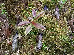Three lower pitchers, all produced by plants from Mount Katopasa, showing the variability in pigmentation exhibited by this species. The pitcher on the left has quite typical colouration, similar to that of plants from Mount Lumut. The reddish pitcher in the centre exhibits a conspicuous indumentum, widely spaced peristome ribs, and a noticeably inclined neck that overarches the pitcher mouth. The trap on the right has unusually dark pigmentation, with the dark blotches merging to form a solid purple surface. This specimen also displays golden highlights on the peristome ribs and a colourful waxy zone on the interior.