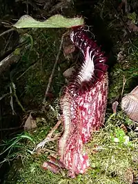 In response to subsequent speculation about the plant's taxonomic status, Lee wrote that it "merely represents a geographical variant of N. hamata".[21] It was informally known as N. hamata "red hairy" or simply "red hairy hamata" (often abbreviated as 'RHH').[22] In 2020, this taxon was described as a species in its own right: N. diabolica.[22] Like the type form of N. hamata, N. diabolica has been raised to flowering size in cultivation and used to make hybrids with other Nepenthes species.[23]