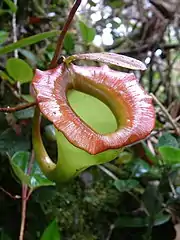 Upper pitchers are much larger, growing up to 15 cm high and 10 cm wide. Wings are reduced to ribs that run down the front of the pitcher. The greatly expanded peristome may reach 3.5 cm in width in aerial pitchers. The lid does not cover the mouth completely, being narrowly ovate. It is up to 5 cm long and 2 cm wide. The crater-like glands on the underside of the lid may be up to 1.5 mm wide. These glands are so large that they are visible as swellings on the upper surface of the lid. The spur is simple and up to 1 cm long. Pitchers range in colour from light green to dark purple throughout and may be lightly speckled. The most common form of this species has green pitchers with a red peristome.[1]