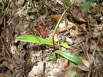 Despite there being only a very small number of known N. pitopangii specimens, the taxon is not thought to be of hybridogenic origin.[3][4] It is unlikely to be a natural hybrid involving N. glabrata since the closest known population of that species is more than 50 km from the type locality of N. pitopangii.[3] The only other Nepenthes from Sulawesi that produce infundibular upper pitchers are N. eymae and some forms of N. maxima. However, all recorded natural hybrids with these species exhibit petiolate leaves and typically have triangular lids with appendages on their lower surface.[3]