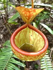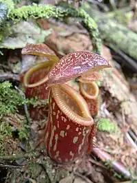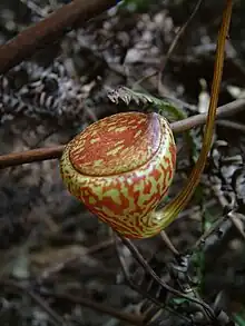 | An upper pitcher of Nepenthes pitopangii at the type locality in Lore Lindu National Park | |