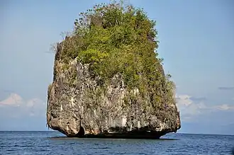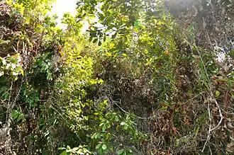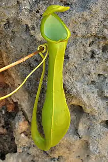 The tiny islets this species inhabits around Dinagat provide striking micro-habitats, often having near-vertical rock walls and highly vegetated tops. Here, N. viridis plants occasionally grow lithophytically,[1] their roots anchored in fissures.[7] Where present, surrounding vegetation provides support for the plants' scrambling vines, though these may overhang the sheer rock faces, dangling only a few metres from the water. Exposed to direct sunlight, the dark rock walls can get very hot, and during particularly dry periods any N. viridis plants in close proximity will largely wither, leaving only a few green shoots.[1]