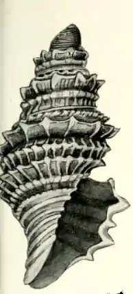 (Original description) The small, yellowish brown shell is broadly fusiform, It contains five whorls, including a prominent two-whorled protoconch, which is finely spirally lirate. The adult whorls are strongly angled about the upper third by a prominent spiral keel, which bears at regular intervals well developed spinose nodules, about 10 on the body whorl. Above to the suture the whorl is concavely hollowed, with a finely nodulous keel. Below the carina are two prominent keels, bearing numerous sharp nodules, connected somewhat irregularly above and below, with axial riblets. On the base are about seven keels, the first two slightly nodose, the rest smooth. The three prominent keels give the whorls a square appearance. The aperture is rather expanded. The siphonal canal is short and open. The columella is concave, corrugated by the basal keels, which pass into the shell. The outer lip is armed by four spines, alternating large and small. The sinus is sutural, deep and narrow, bounded on one side by the sutural lirae, and on the other by the finely a nodulous keel. [2]