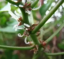 Neraudia angulata is a rare species of flowering plant in the nettle family known by the common name angularfruit ma'oloa. It is endemic to Hawaii, where it is known only from the Waianae Range on the island of Oahu.[1] There are nine remaining populations with a varying number of individuals; in 2006 there were 227 mature individuals counted.[2] This is a federally listed endangered species of the United States.