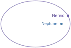 Nereid orbits Neptune in the prograde direction at an average distance of 5,504,000 km (3,420,000 mi), but its high eccentricity of 0.749 takes it as close as 1,381,500 km (858,400 mi) and as far as 9,626,500 km (5,981,600 mi).[15]