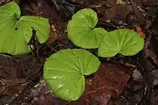 Nervilia crociformis, commonly known as the trembling nervilia[2] or round shield orchid,[3] is a small terrestrial orchid found in South and Southeast Asia and in New Guinea and northern Australia. It has a single short-lived green flower with a white labellum. A more or less circular leaf held horizontally above the ground emerges at the base of the flowering stem after flowering.