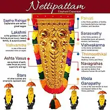 Nettipattam is an ornament used in Kerala to adorn the forehead of temple Elephants during Temple festivals and other auspicious events. Nettipattam is often translated into English as an elephant caparison. Nettipattam is made with Gold and Copper. It is an integral part of Kerala culture. The Legend has it that Lord Brahma was the first divinity to design a forehead embellishment for Lord Indra's white war elephant, the Airavata.[1][2]