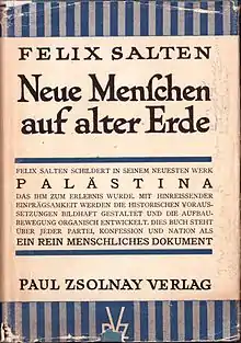 Neue Menschen auf alter Erde: Eine Palästinafahrt (German: “New people on ancient soil: A tour to Palestine”) is a 1925 travel book by Felix Salten, depicting his 1924 visit to Mandatory Palestine. Like his 1931 travel volume Fünf Minuten Amerika, also Neue Menschen auf alter Erde was first published as a series of feuilletons in a Vienna newspaper. Salten himself considered these two books to be his foremost.[1]