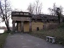 The palace kitchen, built between 1788 and 1790, an artificial ruin facing lake Heiliger See, was designed to look like a half-buried temple near the foot of a flight of stairs leading down from a terrace of the Marble Palace, to which it was connected by an underground corridor.