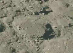 This is a worn crater formation with features that have been softened and rounded by a history of minor impacts. But the rim remains intact and has not been significantly reshaped or indented by notable craters. The only crater of note within the rim is a small craterlet on the floor near the northern rim. There are much smaller craters scattered across the nearly flat and level floor, but no significant ridges or a central peak. In short, this crater appears as just an old depression in the surface.