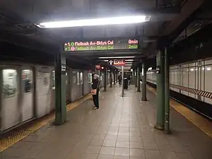 The Nevins Street station is an express station on the IRT Eastern Parkway Line of the New York City Subway. Located at the intersection of Nevins Street, Flatbush Avenue, and Fulton Street in Downtown Brooklyn, it is served by the 2 and 4 trains at all times, the 3 train all times except late nights, and the 5 train on weekdays only.[3]