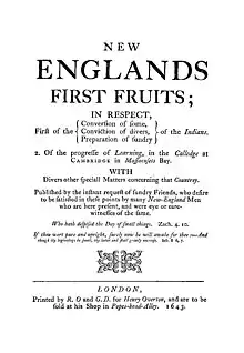 New England's First Fruits was a book published in London in 1643 about the early evangelization efforts by the Puritans in colonial New England in defense of criticisms from England that little evangelism was being pursued in New England.[1][2] It was the first publication to mention Harvard College.[3]