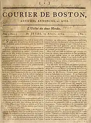 The French language remained extant in Boston during its time as a British colony, though not abundant, one reason being a fear of the influence of Catholicism; academically this prevented the language from gaining early acceptance at Harvard, when its first instructor was dismissed in 1735, after two years of teaching, due to rumors of converting students from Protestantism.[10] Six decades later, one of the first publishers of a French textbook in the Americas was Harvard's first salaried French instructor, Joseph Nancrède, who compiled then-contemporary French texts and published them alongside limited English translations in his L'Abeille Françoise in 1792. Years before, in 1789, Nancrède established the first French newspaper of Boston, a short-lived weekly published for six months that year which he described in its prospectus as a means to foster commerce between the Americans and French-speaking world, and "to convey adequate ideas of the Majesty of Congress to nations who scarcely know that there is one existing."[10][11]
