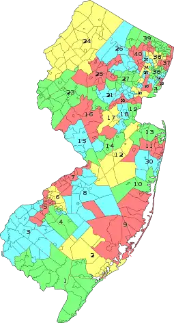 The New Jersey Apportionment Commission is a constitutionally-created ten-member commission responsible for reapportioning the forty districts of the New Jersey Legislature. The commission is convened after each decennial U.S. Census, and the districts are to be in use for the legislative elections in the following ten years. The commission's members are appointed by the two most successful political parties in the previous gubernatorial election. Each party appoints five members. If the commission cannot agree to an districting plan in a timely manner, the Chief Justice of the Supreme Court of New Jersey is to appoint an eleventh member as a tie-breaking vote.[1]