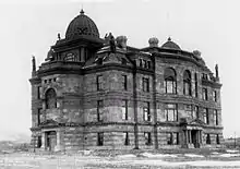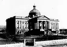 The next capitol building, designed by Isaac Rapp, was not completed until 1900.[11] In the meantime, the government was housed in the Territorial Court House, and the adjoining judicial offices. After the costly loss of the previous building, the new capitol was completed on a shoestring budget of less than $140,000, using salvaged materials and unpaid convict labor from the Penitentiary of New Mexico to save money. The building was three stories high with a silver dome, cupola, and neoclassical portico. The first story was constructed from sandstone reused from the old capitol, while the second and third floors were yellow brick and the portico was Indiana limestone.[12][13] It was dedicated on June 4, 1900.[14]