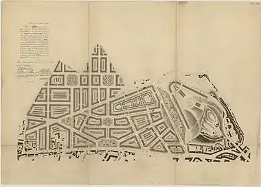 Craig's original plan has not survived but it has been suggested that it is indicated on a map published by John Laurie in 1766.[4] This map shows a diagonal layout with a central square reflecting a new era of civic Hanoverian British patriotism by echoing the design of the Union Flag. Both Princes Street and Queen Street are shown as double sided. A simpler revised design reflected the same spirit in the names of its streets and civic spaces.[3]