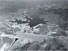 Located 1.25 miles (2.01 km) northwest of the dam and serving excess water levels are two different spillways: a 590 feet (180 m) long un-gated free flow with a crest elevation of 1,706.5 feet (520.1 m) and a 370 feet (110 m) long fuse plug embankment with an elevation of 1,711 feet (522 m). The free flow spillway has a discharge capacity of 187,000 cubic feet per second (5,300 m3/s) and the fuse plug 129,000 cubic feet per second (3,700 m3/s). At an elevation of 1,728 feet (527 m), both spillways would have a combined capacity of 316,000 cubic feet per second (8,900 m3/s).[5][6]