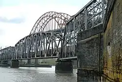 The New Westminster Bridge was constructed in 1904 and formally opened on July 23 by the Lieutenant governor of British Columbia.[1] It was originally built with two decks; the lower deck was used for rail traffic while the upper deck was used for automobile traffic.[5]