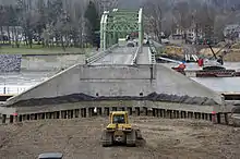 For the next three months, the bridge over the Mohawk River and NY 103 remained closed while repairs were made to the 400-foot (120 m) long collapsed section of roadway near NY 5. This section also had structural issues due to the flooding. The project cost $3 million, paid for by federal aid received by United States Senators Charles Schumer and Kirsten Gillibrand,[15] and was completed by the New York State Department of Transportation (NYSDOT) on December 22, 2011, two weeks earlier than planned. In all, NY 5 received 115,000 cubic yards (88,000 m3) of soil and 5,500 cubic yards (4,200 m3) of stone to protect the roadway from future floods. NY 103 had its roadway reconstructed, a new sidewalk installed on the western side of the highway, and new signage and guide rails installed in both directions.[16] NYSDOT plans to repave NY 103 in early 2012.[17]