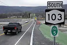The entirety of NY 103 is part of New York State Bicycle Route 5 (NY Bike Route 5),[5] a cross-state bicycle route extending from Niagara Falls to the Massachusetts state line at New Lebanon.[6] NY Bike Route 5 continues west from NY 103 on NY 5S and east from NY 103 on NY 5.[5]
