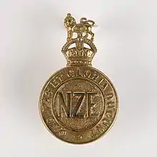 The collar badge worn by the Royal New Zealand Engineers is a grenade with a scroll inscribed with "ubique". The New Zealand Tunneling Company instead used the Maori translation of the motto, "inga whai katoa", on their collar badges. The grenade badge has nine flames, in contrast to the very similar seven flame badge of the Royal New Zealand Artillery.[47]