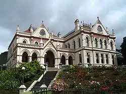 The current library building occupied by the Parliamentary Library in Wellington was completed for the General Assembly Library in 1899. It is the oldest of the extant buildings in the Parliament complex. It stands to the north of Parliament House (to its right, looking from the front). The library was originally designed as a three-storey building by Thomas Turnbull in Gothic Revival style.[19] It was fire resistant, being constructed of brick made at Mount Cook gaol[20] with an iron firedoor separating the then General Assembly Library from the main entrance section. The third storey of the design was not built to save money (costs had reached £50,000) and it was completed by the government architect John Campbell. He redesigned the parapets, gables and roof to take account of the building's reduced height.[21] Turnbull dissociated himself from the entire project and asked for his name to be removed from the foundation stone.[22]