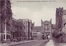 Unlike the majority of other students' unions in the United Kingdom, Newcastle University Students' Union owns the building where it is housed. The Union building was built in 1924 with a gift from an anonymous donor, who is believed to have been Sir Cecil Cochrane, a major benefactor to the university.[4] It is built in the neo-Jacobean style and was designed by the local architect Robert Burns Dick whose firm designed the Laing Art Gallery, the towers of the Tyne Bridge and The Spanish City in Whitley Bay. It was opened on 22 October 1925 by the Rt. Hon. Lord Eustace Percy, who later served as Rector of King's College from 1937 to 1952. In 1987 the Students' Union was made a Grade II listed building.[5]
