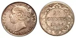 The Newfoundland ten cent coins exist as a bronze pattern with the adopted obverse from the New Brunswick coin (the words Newfoundland substitute New Brunswick). This design adoption is similar to that used for Newfoundland five cent coins.
