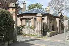 After Sir George Stewart's death in 1822, Newington House had passed through a number of owners until its occupation in 1852 by Liberal politician, Duncan McLaren. At the western edge of Newington, McLaren acquired the lands of Mayfield and Rosebank along with the village of Powburn.[46] From 1862, the area around Waverley Park was feued to a plan by David Cousin.[47] In 1864, Cousin radically revised this scheme to create a plan of curving streets centring on a communally-owned green space at Waverley Park. This may have been inspired by a similar scheme at London's Ladbroke Grove. Cousin also proposed that, like the Blacket development to its north, entry to this scheme would be guarded by gates and lodges.[48] Lodges remain at the Dalkeith Road entrance to Queen's Crescent and on Peel Terrace.[49]