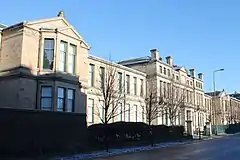 The 19th century saw the establishment in Newington of several health and educational institutions. Completed in 1877 on the site of the old settlement at the Powburn, the West Craigmillar Asylum for Blind Females superseded the blind asylum on Nicolson Street.[18] In 1875, Longmore Hospital on Salisbury Place opened as the Edinburgh Hospital for Incurables.[57] Founded by a bequest of John Alexander Longmore, the hospital occupied the former site of several houses and a boys' school known as Wilson's Academy.[33] Other schools of this period in Newington included Munro's Academy and Robertson's Academy, which occupied a Gothic building on the site of what is now South Oxford Street.[28] St Margaret's School was founded in Craigmillar Park in 1890 as Queen Margaret's College for Young Ladies.[58] Also in 1890, Madame Muriset's Craigmillar Park College was established on Crawfurd Road as a girls' boarding school. It closed at Muriset's retirement in 1932, by which time it was also accepting boys.[59] By 1896, the need for a new public school in Newington and the Southside was recognised by the foundation of Preston Street School on the corner of East Preston Street and Dalkeith Road. It opened in 1897 and remains in use as a primary school.[60] St Columba's Roman Catholic Church had opened an attached school the previous year on Strathearn Road in Marchmont. In 1897, this moved to Newington Road, moving again to the former Causewayside School building in 1924. It closed in 1941.[61]