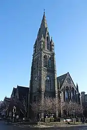 - Mayfield Salisbury Parish Church, Mayfield Road: designed by Hippolyte Blanc in the French Gothic style and constructed between 1876 and 1879. Its 48m (157ft) spire was added in 1894, at which time the apse was enlarged. The roof, including its flèche, was destroyed by fire in 1969 and the ceiling was reconstructed by David Carr and Stewart Tod. The church includes a notable collection of late 19th and early 20th-century stained glass, including works by Oscar Paterson, Ballantine & Gardiner, and Guthrie & Wells.[127] The church's spire is a prominent local landmark.[109] J. Brian Crossland referred to the church as "a building of great originality and importance".[128]