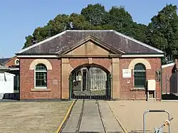 The site has a 2 ft (610 mm) narrow gauge electric railway with 60v battery locomotives which were used for transporting munitions and now visitors around the armory.[23][24] The train is currently not in operation (as of 2020) but is expected to return.[25] The circuit runs through some restricted areas and partly goes outside the boundary of the Newington Armory into a publicly accessible area where the tracks cross over the Louise Sauvage Pathway twice.